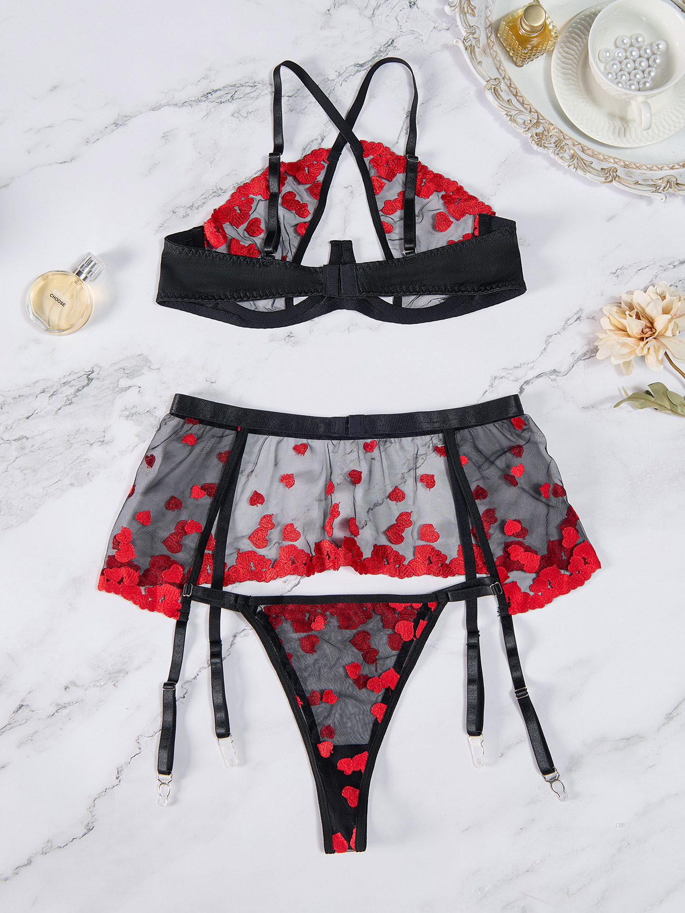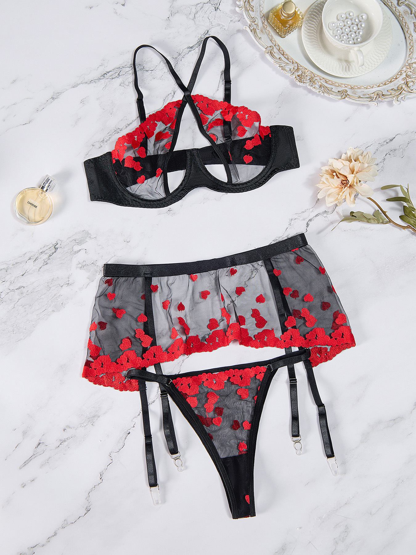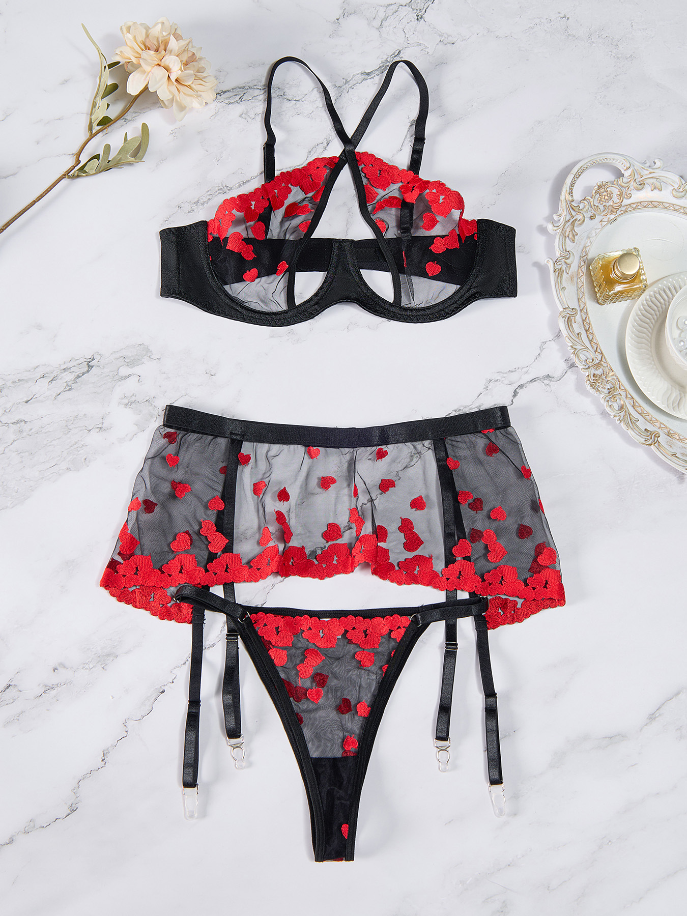 Copy| Product Name | Sexy Lingerie Embroidered Three-piece Set of Lace Pajamas |